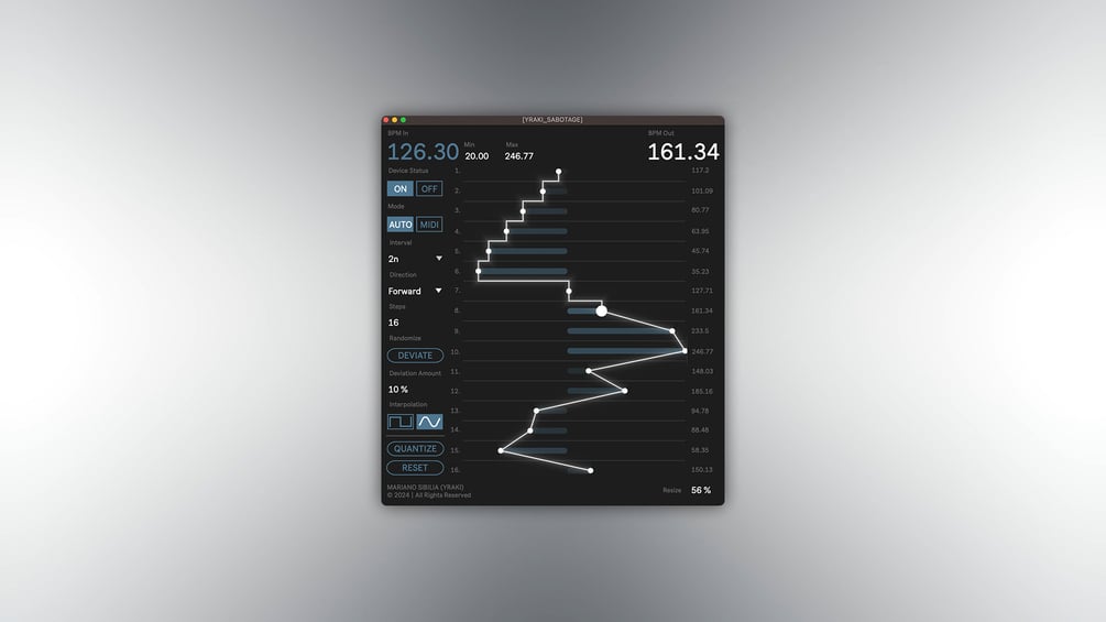 While automating master tempo in Ableton has been possible before, SABOTAGE expands this concept by providing more flexibility. It includes adjustable tempo ranges that allow for precise control over tempo shifts. Users can choose from two sequencing modes: AUTO, which syncs with Ableton's transport, and MIDI, which triggers tempo changes through incoming MIDI notes. Additionally, you can adjust the probability of tempo shifts and use features like deviation and interpolation for more refined and nuanced tempo changes.